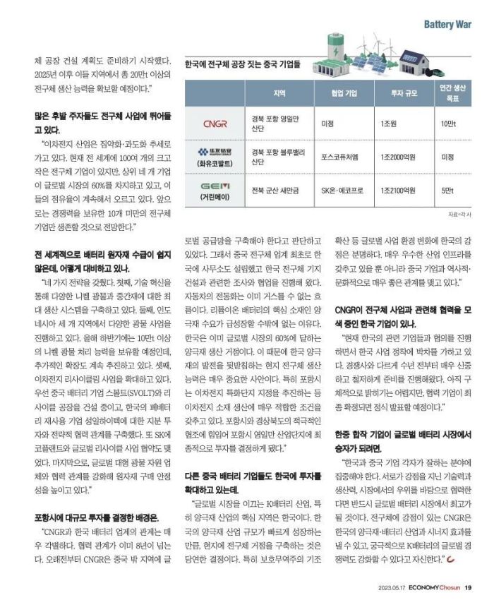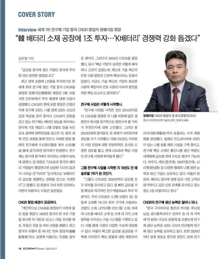 近日,韩国权威经济周刊《Economy Chosun(经济朝鲜)》专访bv伟德源自英国始于1946股份董事长邓伟明,并以“封面故事”刊发在第492期以“电池之战”为主题的周刊中。
