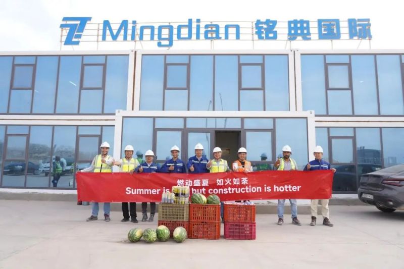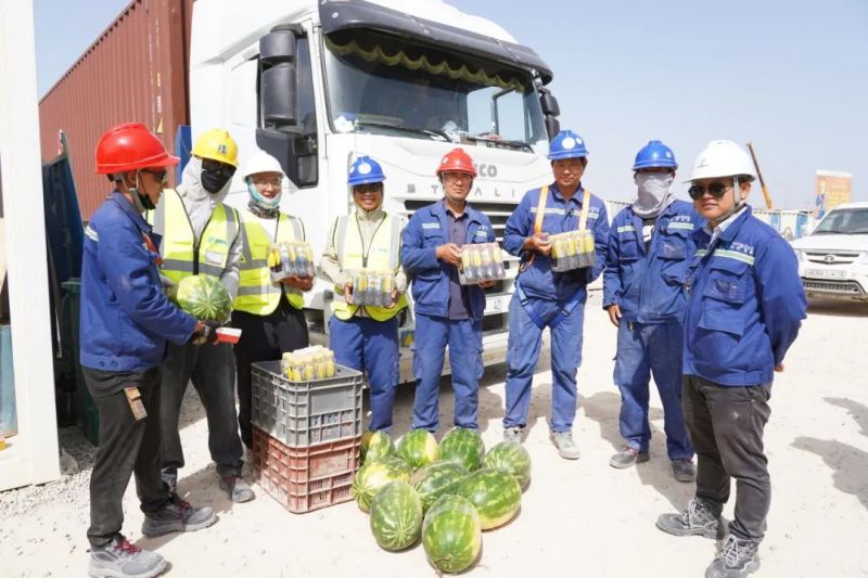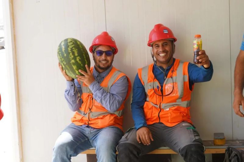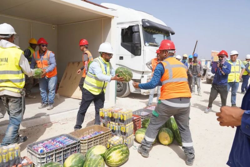 尽管高温炙烤,项目现场的工人们仍坚守一线、不畏酷暑、辛勤工作,确保工程建设的顺利进行。此次,摩洛哥项目组为施工人员准备了500瓶酸奶、500瓶凉茶、2000斤西瓜等防暑降温物品,按各单位人数送至施工现场分配发放。