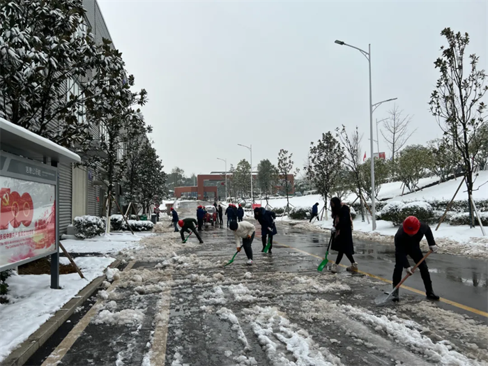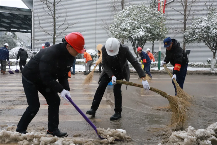 西部产业基地领导班子率先垂范,基地总经理邓光明,常务副总经理张朝华以及公司各分管领导纷纷加入扫雪队伍,充分发挥引领作用。志愿者们热火朝天地参与到行动中,一时间,扫雪队伍成了银装素裹下产业基地的一道美丽风景线。