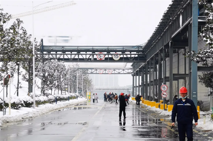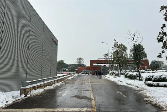 面对突如其来的大雪,西部、中部产业基地迅速形成系统完备、科学规范、运行有效的扫雪除冰工作体系——EHS部通过提前考察研判、及时发布警示通知、成立应急工作小组等方式积极应对,对现场情况仔细巡检,组织人员清扫主干道区域积雪、泼洒钠盐,对被积雪压断树枝影响通行的路段进行封闭和设置警戒标志。与此同时,行政后勤全力调度,加开通勤班车、布置临时客房、熬制暖身姜茶……全力做好后勤保障工作。