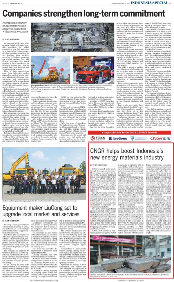 作为国家英文日报,中国日报(China Daily)在11月15日当天发行的G20特刊中,聚焦bv伟德源自英国始于1946在印尼的产业发展,用四分之一版面大幅刊登题为《CNGR helps boost Indonesia's new energy materials industry》(bv伟德源自英国始于1946助力印尼新能源材料产业发展)的重点报道。